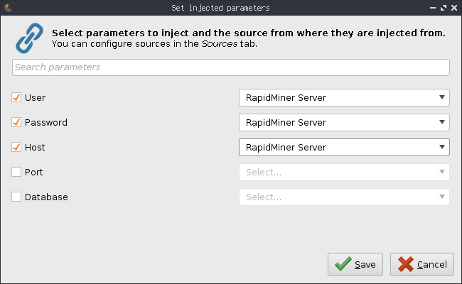 user,passwordandhostas injected by clicking on the Set injected parameters button in the Basic tab. Be sure to select RapidMiner AI Hub as source for the injected parameter. This will then use your RapidMiner AI Hub.
