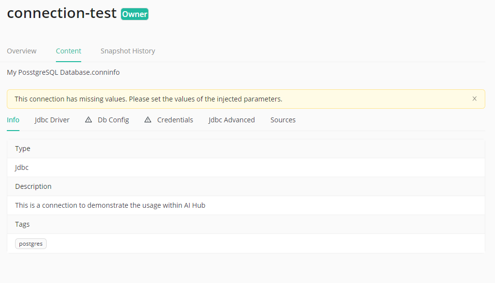As long as no values are set for the user which browses the details page of a connection, a warning will be displayed that not all values have been set. To be able to run a process which uses this connection the currently logged in user needs to set their values for all injected parameters of the browsed connection.