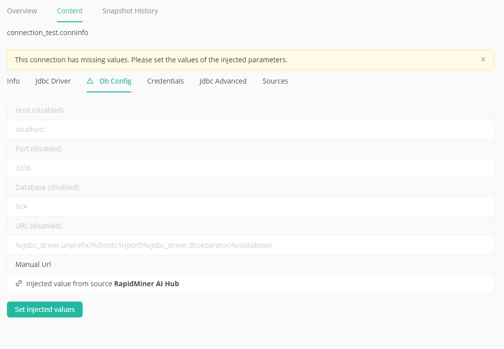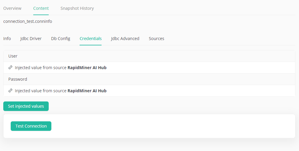 When all required values are set a Test connection button is displayed. It can be used to test if a connection can be successfully established with the injected values from RapidMiner AI Hub.