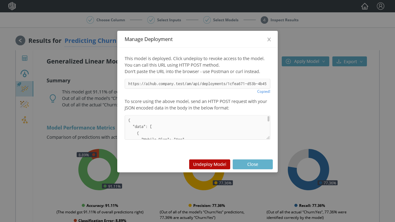 Make sure to copy the URL, since it includes the model id that will be inserted into the JSON snippet.