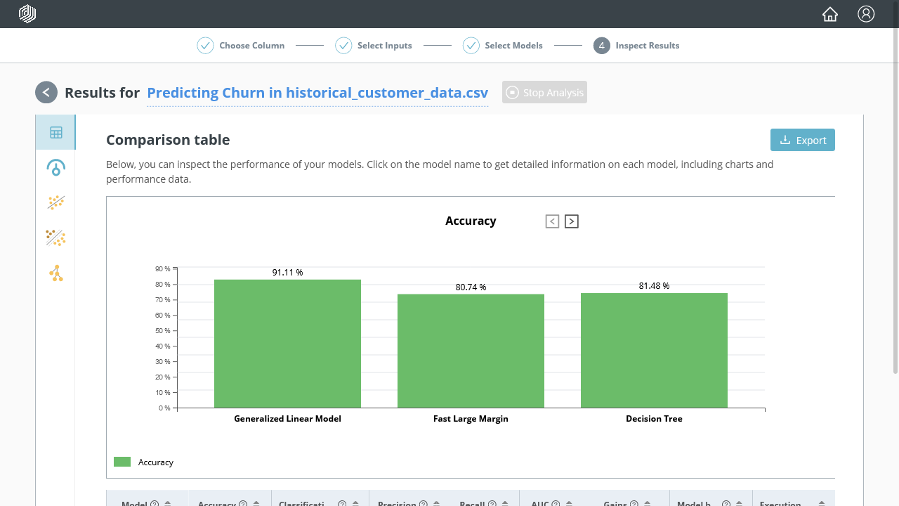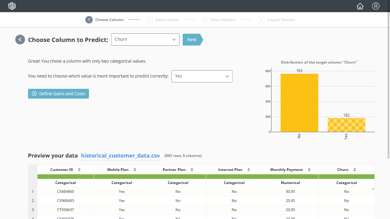 In Choose Column to Predict, select Churn: