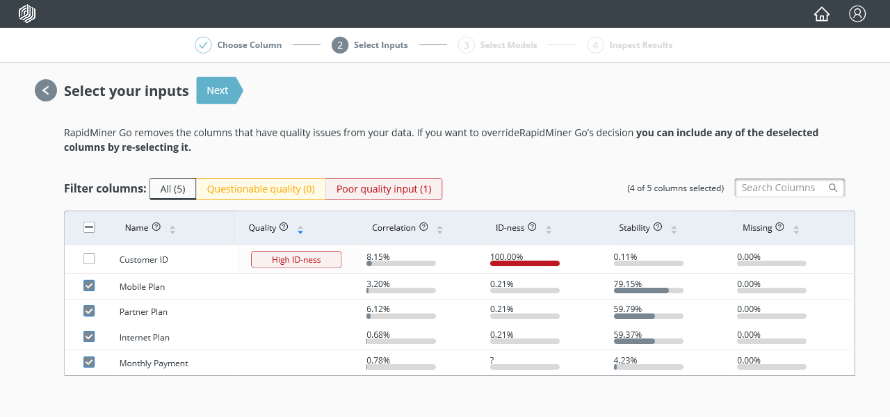 In Select your inputs, RapidMiner Go will automatically detect the Customer ID column as a unique identifier and exclude it from the analysis based on High ID-ness: