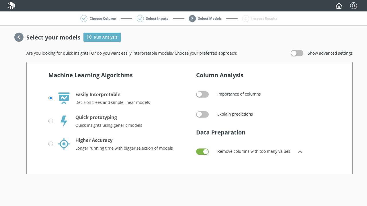 For this example we use the preset focusing on Easily interpretable algorithms, but you can of course use other algorithms.