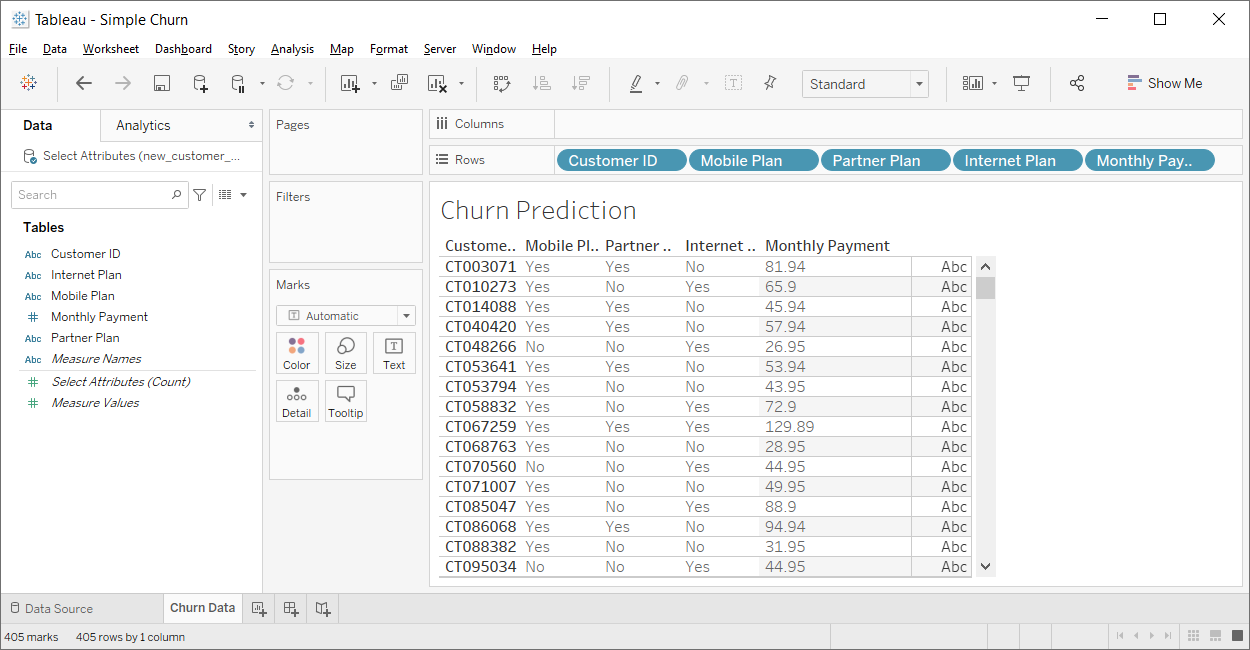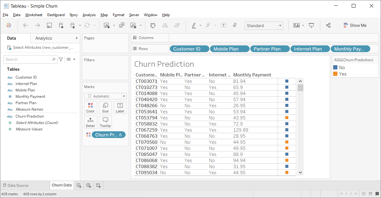 We can now add this table calculation to the Tableau dashboard, e.g., as a color mark for the table. Tableau will update the dashboard automatically with the churn predictions returned by RapidMiner Go: