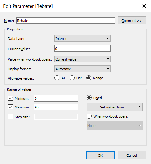 In the first step, we create a parameter called Rebate, with range of values between 0% and 90%.