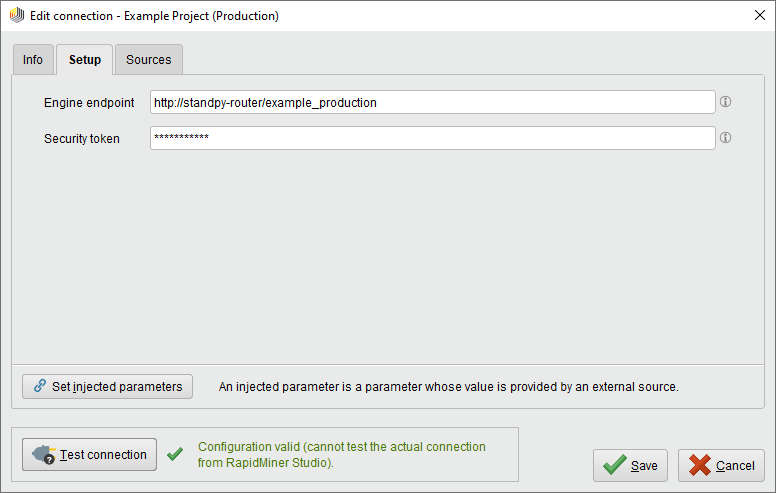 Given that RapidMiner StandPy is only available from within RapidMiner AI Hub, we can only validate but not test the connection from RapidMiner Studio: