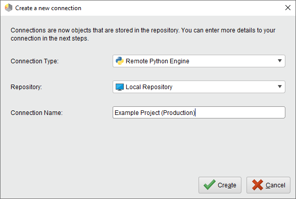 The Python Scripting Extension uses the connection framework for managing remote Python engines (RapidMiner StandPy containers). To configure a connection to the production container from the previous section, we need to create a new connection of type Remote Python Engine. As always, you can choose an arbitrary name for the connection itself: