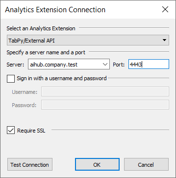 - As described above for Tableau Desktop, enter the connection details for RapidMiner AI Hub.