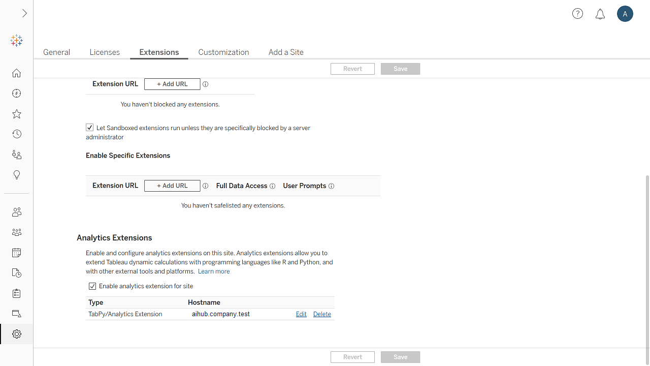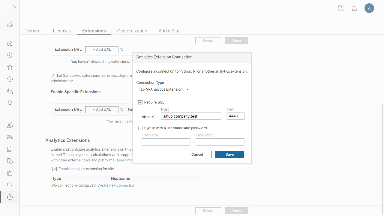 On Tableau Server, log in as administrator for the site where you want to enable the analytics connection.