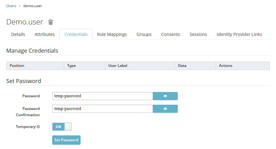 The second step is to set a (temporary) password for the user. To do this, go to the Credentials tab and add the user's new password to the Password and Password confirmation fields. By default, the password you set will be a temporary one and the user will have to change it on their first login. To change this, set Temporary to Off.