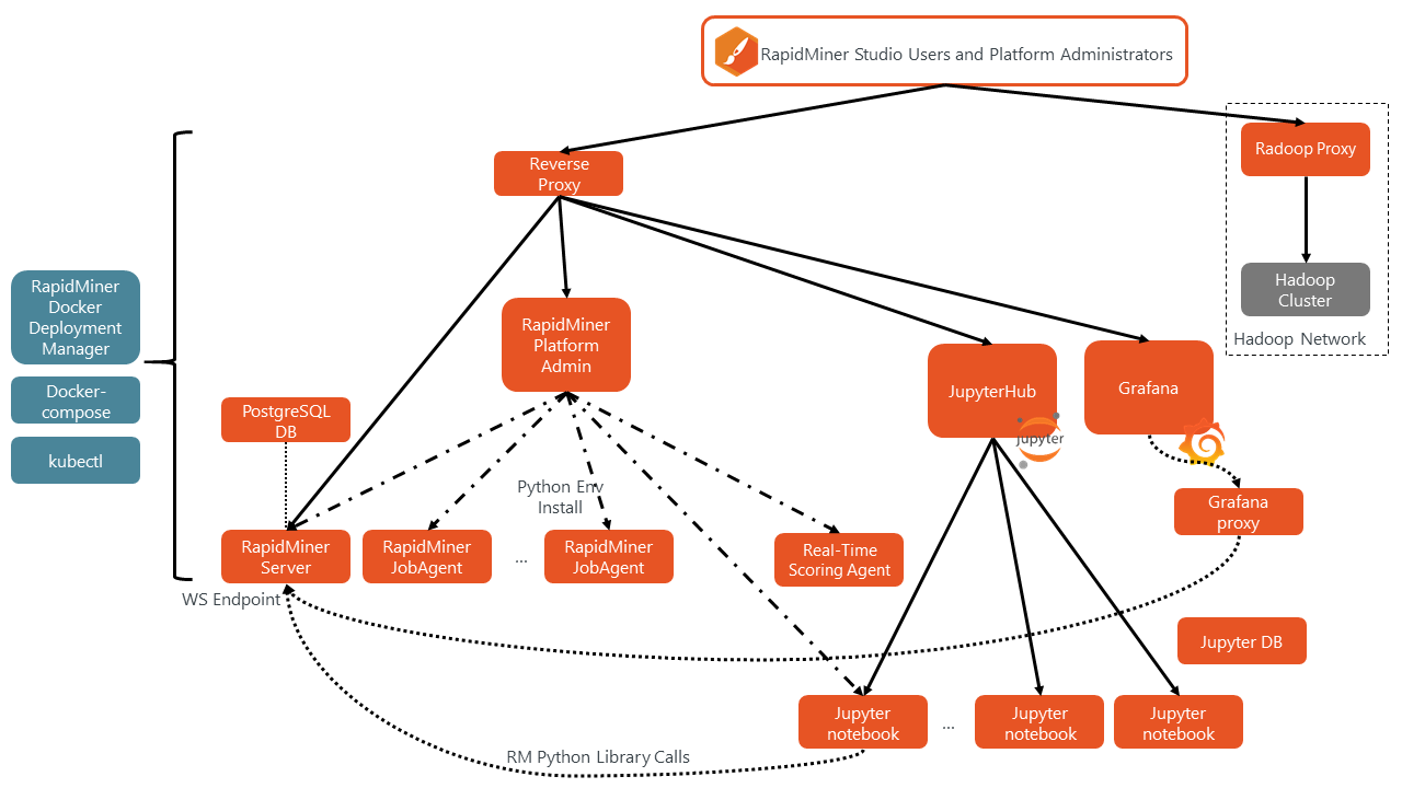 This page provides an overview of existing deployable components and how they fit together in the RapidMiner platform deployment.