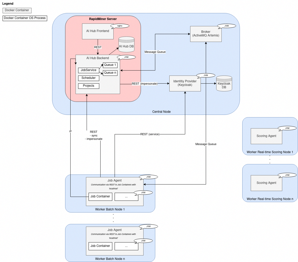 The Job Container spawned by the Job Agent runs a RapidMiner Studio instance that is capable of executing a RapidMiner process. It's bound to a system port in order to accept jobs from the Job Agent via REST API.