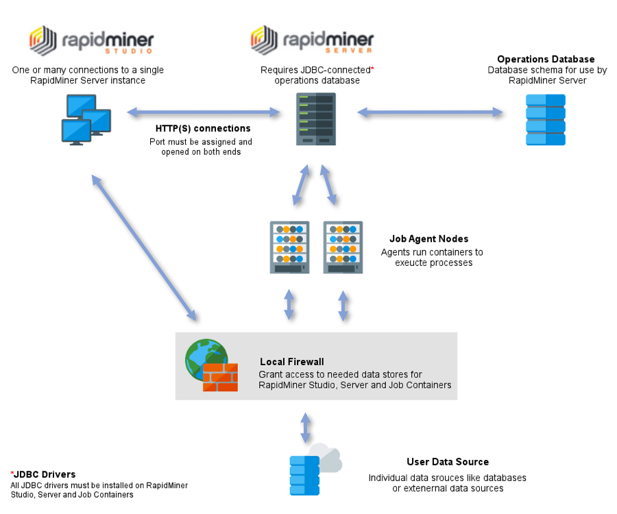 RapidMiner Server is the central component in the architecture. You interact with it via a web interface or via RapidMiner Studio. Its main responsibilities are: