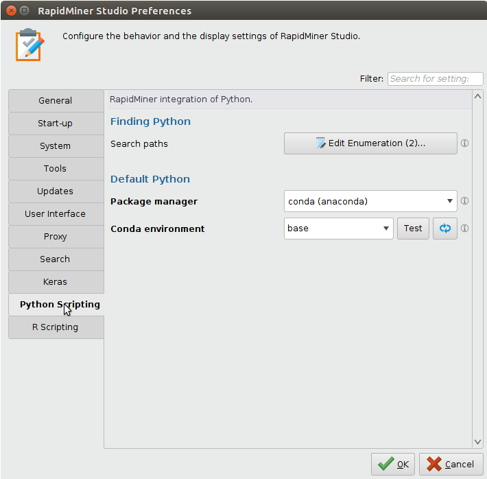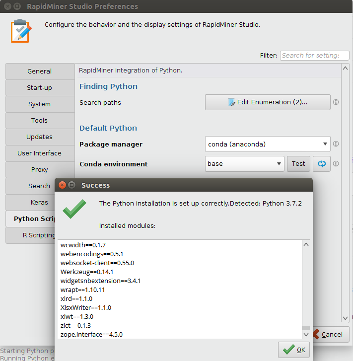 To be able to run Python code within the RapidMiner operators provided by the Python Scripting Extension, you will need a working Python environment. We recommend the best practice of using a package manager which supports multiple environments for the sake of isolating package dependencies to ensure reproducible execution. The extension supports Anaconda and virtualenvwrapper as package managers.