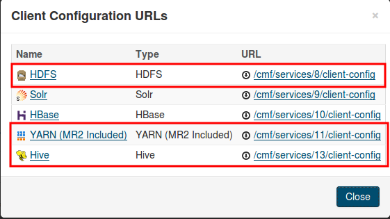 Download the client configuration for HDFS, YARN (MR2 Included) and Hive services to a directory.