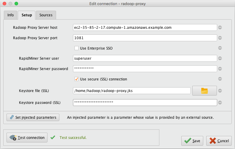 Start RapidMiner Studio and create a New Radoop Proxy connection. Use the <Master public DNS name> (from step 2) as the Radoop Proxy Server host. Make sure to test the Proxy connection via the Test Connection button.