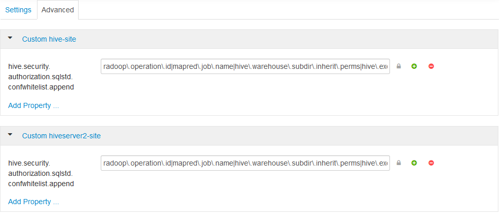 hive.security.authorization.sqlstd.confwhitelist.appendsetting as a new property to both Custom hive-site and Custom hiveserver2-site. The value should be the following (it must contain no whitespaces):radoop\.operation\.id|mapred\.job\.name|hive\.warehouse\.subdir\.inherit\.perms|hive\.exec\.max\.dynamic\.partitions|hive\.exec\.max\.dynamic\.partitions\.pernode|spark\.app\.name|hive\.remove\.orderby\.in\.subquery