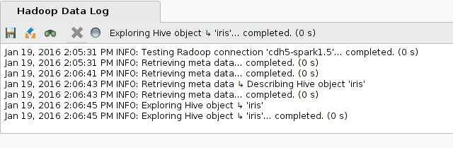 The Hadoop Data Log panel shows information about ongoing operations. You can search and save the log text the same way as you save a process log.