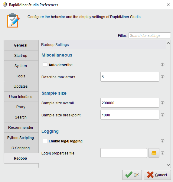 | Enable log4j logging | radoop.log4j | disabled | Determines if log4j logs should be collected into the user folder. |