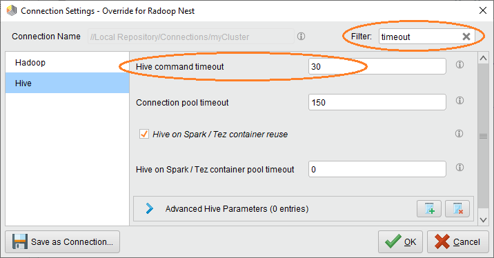 In the Connection Settings - Override window, filter for timeout to make it easier to locate the parameters. Increase the value of the Hive command timeout on the Hive tab, and the Connection timeout parameter on the Hadoop tab.