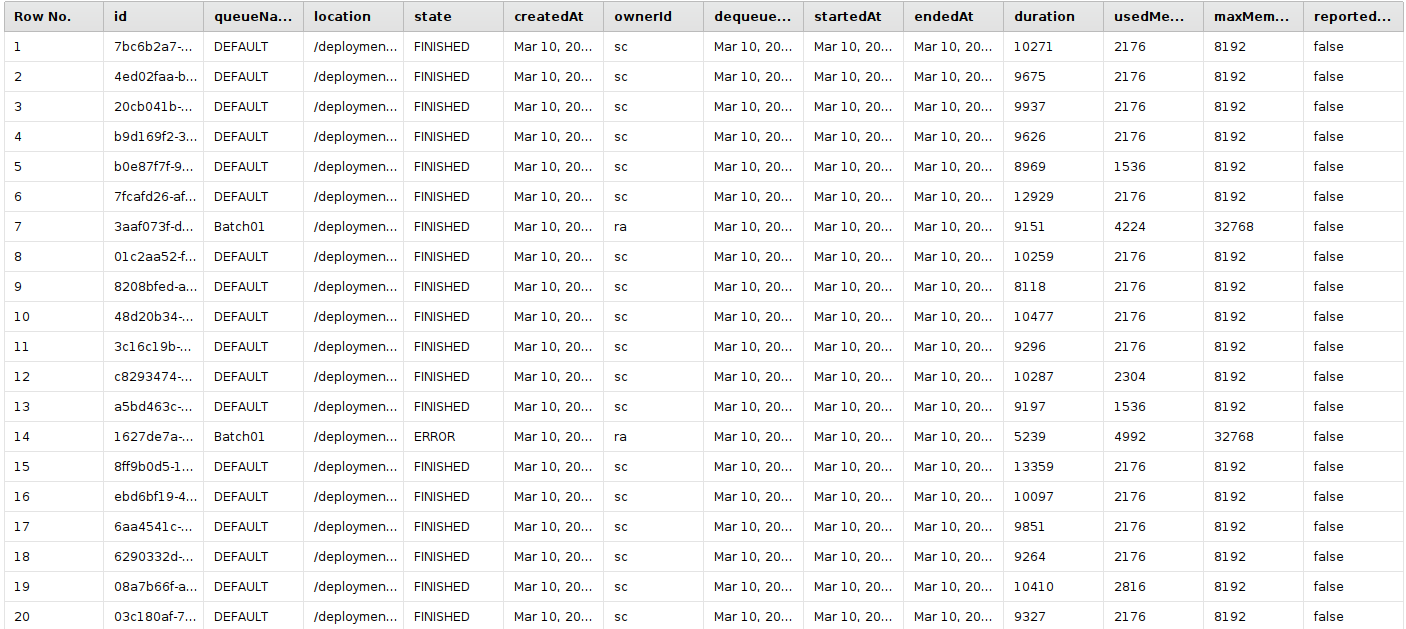 The Get Jobs operator retrieves a list of all jobs that have been executed on an AI Hub. This is exactly the same information that is viewed on the Executions page within the AI Hub web interface. For each job, the resulting ExampleSet shows its job id, queue, location, state, owner id, duration (in milliseconds), used memory (in kb), max memory of the container (in kb), an error flag, and the dates and times of when the job was created, dequeued, started in the job container, and finished. This is very helpful when creating logs and monitoring multiple AI Hub instances.