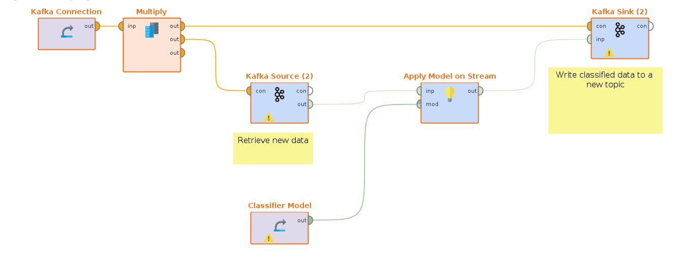 Inside the streaming nest, only operators from the Streaming extension will be translated into Flink or Spark operations and deployed on the streaming server. Other operators like Multiply can help to organize the workflow. Kafka Connection objects point to the input and output data streams and RapidMiner models can be used in combination with the Apply Model on Streams (see below).