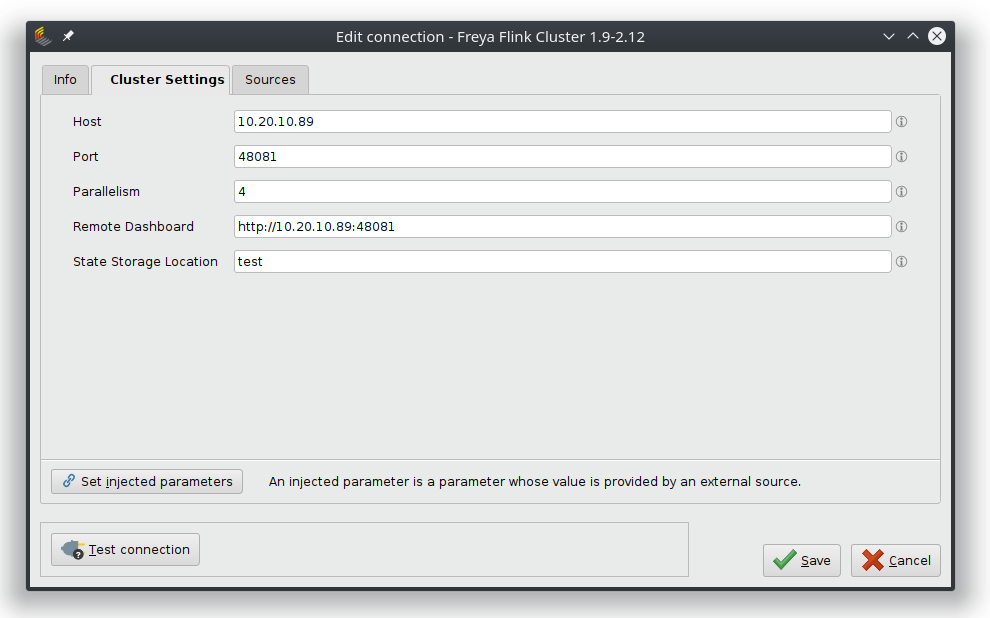 To create a working Flink Connection object in the repository, the necessary properties must be added. These are the host and port information, the applied parallelism level and the address of the remote dashboard.
