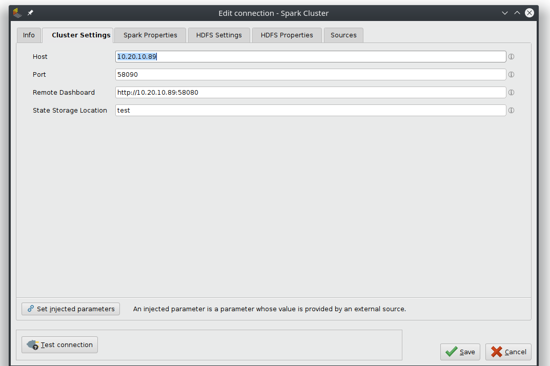 To create a working Spark Connection object, the necessary properties must be added. The Spark Settings tab handles the basic connection and requires the host address and port number and the link to the remote dashboard.