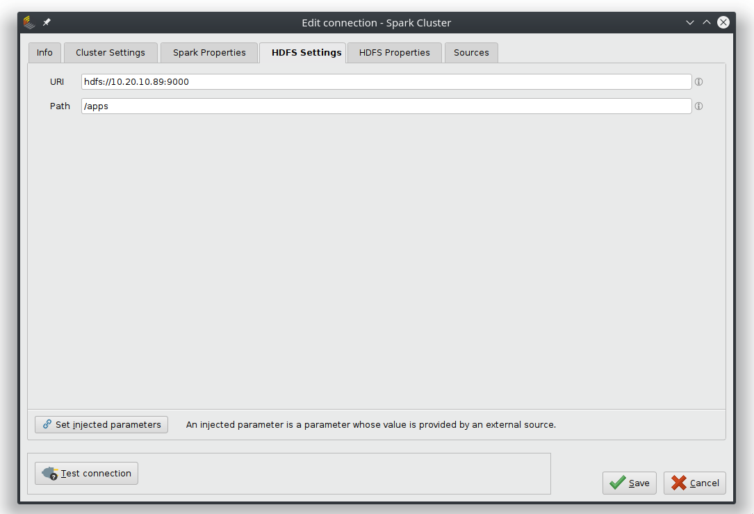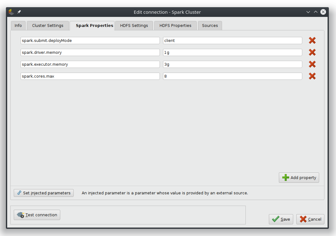 The Spark Properties tab and the HDFS tabs can hold specific properties of the cluster and depend on the used spark version and server settings.
