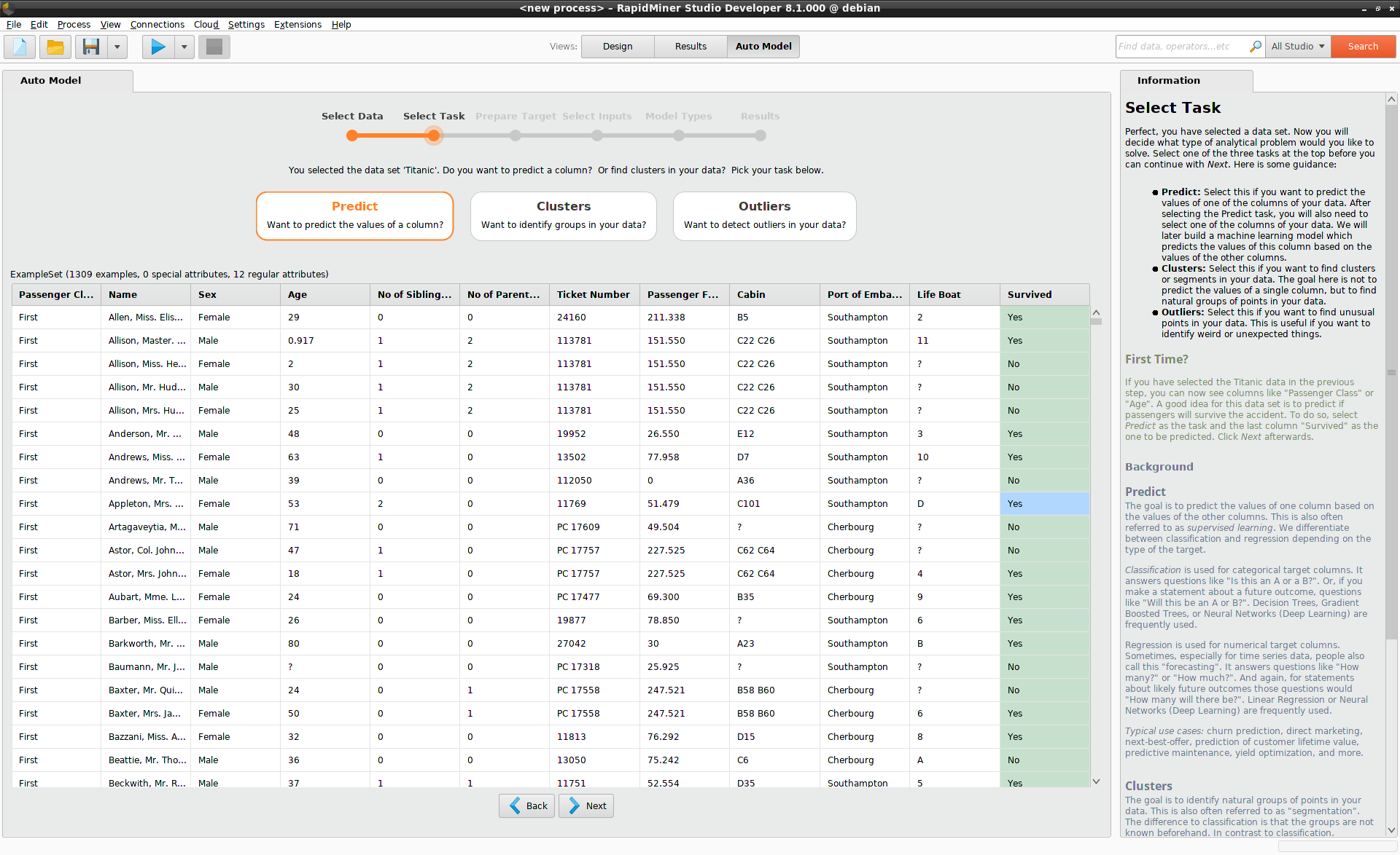 In our example, we want to predict survival on the Titanic, so you should select Predict,