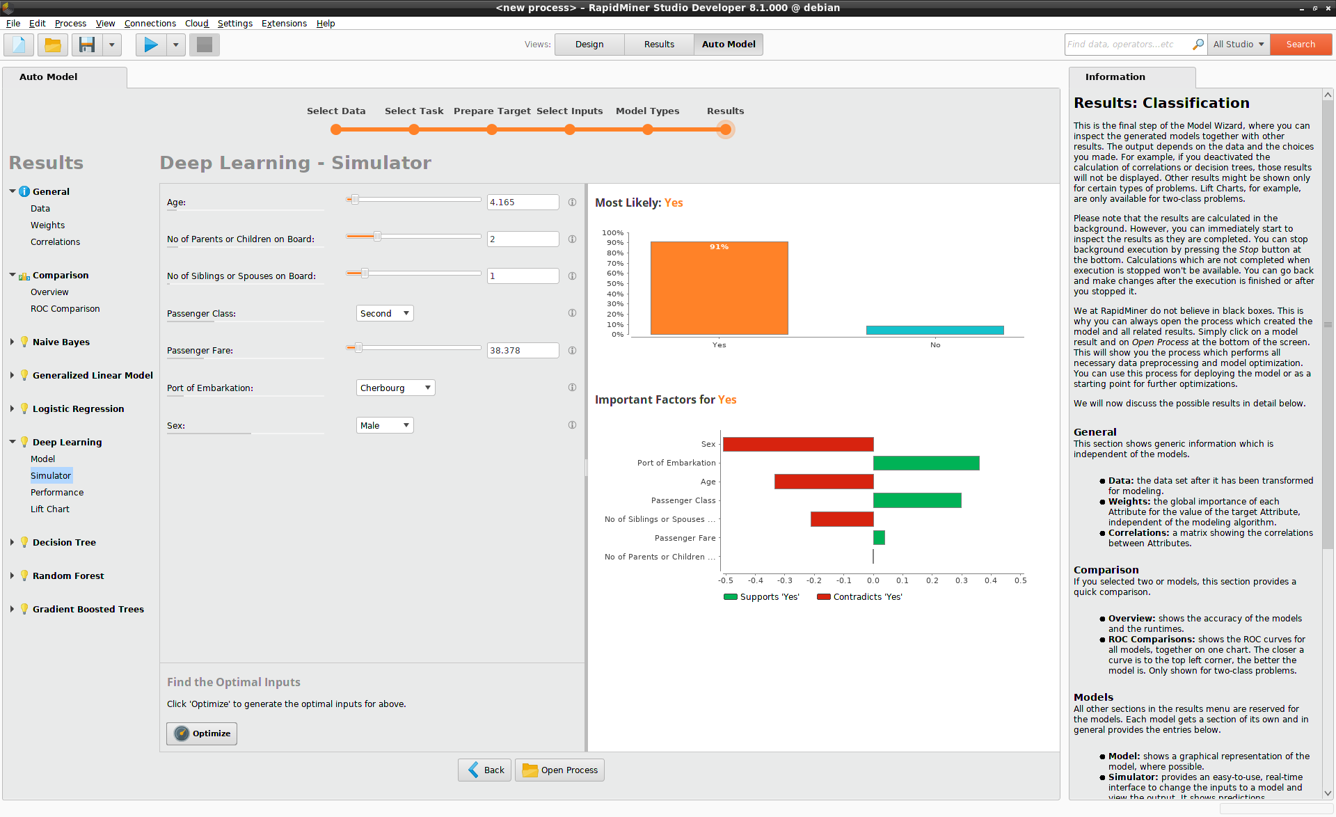 Strictly speaking, we haven't really answered the question of how a male passenger should improve his chance of survival. His age is given, and a more expensive ticket may be financially out of reach. But together the optimizer and the Model Simulator have given us a much better understanding of the Titanic data.
