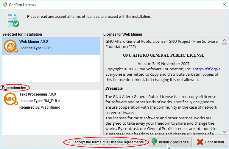 When the download completes, the Confirm Licenses window opens. This window lists any dependencies for your selected extension and allows you to install all necessary components. Accept the terms of the license agreement and click