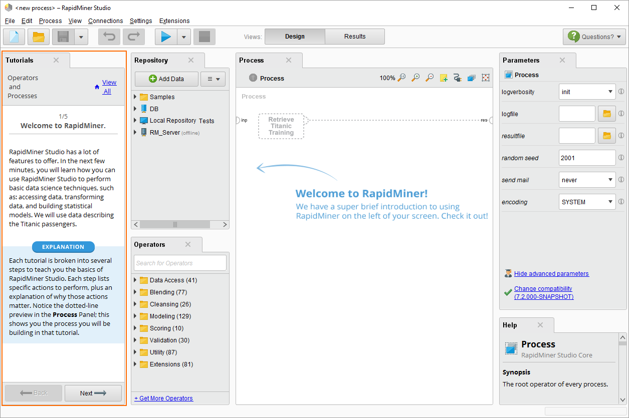 Go be a hero! If this is your first time installing RapidMiner Studio, we recommend that you start with displayed Tutorial to learn just how easy code-free can be. Happy mining!