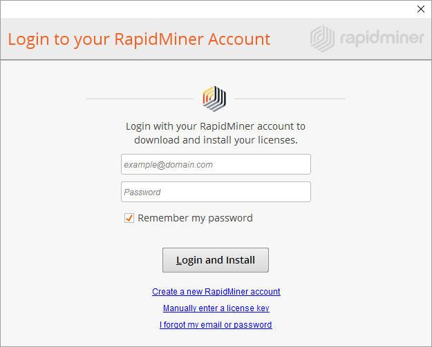 Enter your email address and password to login with your RapidMiner.com account and then click Login and Install.