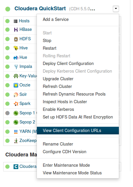 Select Service Actions > Download Client Configs for each of the following services: HDFS, MapReduce2, YARN and Hive. Save the compressed files to a directory.