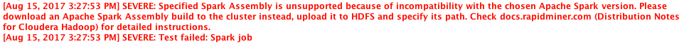 More recent Cloudera Hadoop releases ship Spark Assembly builds that are not compatible with the Apache Spark client shipped with Radoop. Starting from Radoop 7.6.0 the Spark job test properly reports this problem.