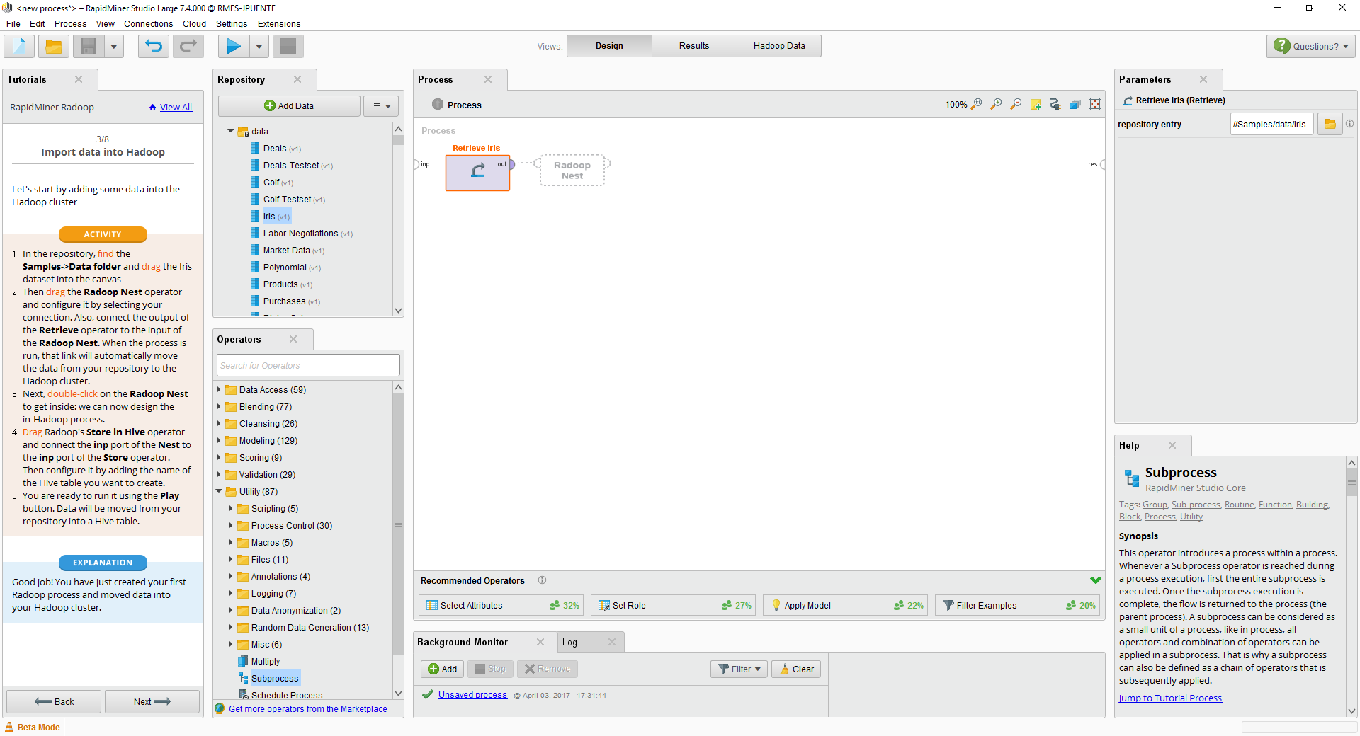A new tutorial has been added to RapidMiner Studio dedicated to providing an easy start for beginners. The tutorial explains how to create full processes and run it in a Hadoop environment. The tasks include simple examples of data ingestion and data movement, data preparation and modeling. The new SparkRM operator, that allows to run any RapidMiner operator in Hadoop is also explained.