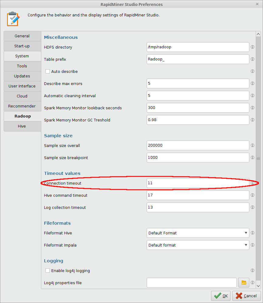 RapidMiner Radoop's connection test process uses a timeout for each small test operation. The default timeout value is 11 seconds. You can increase this value as follows: