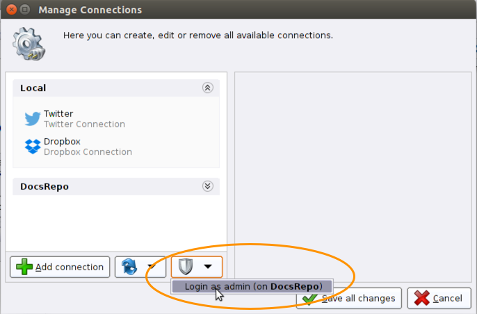 Manage Connections to open the Manage Connections dialog box. Log in as admin, if required.