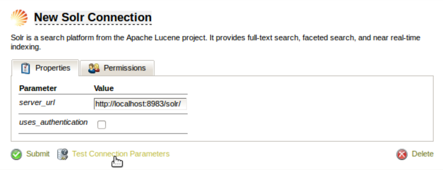 On the Properties tab, enter the URL for your Solr server. (Select uses_authentication if appropriate.) Test the connection and make any adjustments until the connection is confirmed.