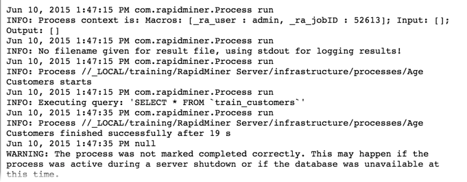 A process log file is available for each process execution on RapidMiner Server. You can view all process logs in the web interface of RapidMiner Server or, via the connected user, from RapidMiner Studio. The logs include both successful and failed processes.