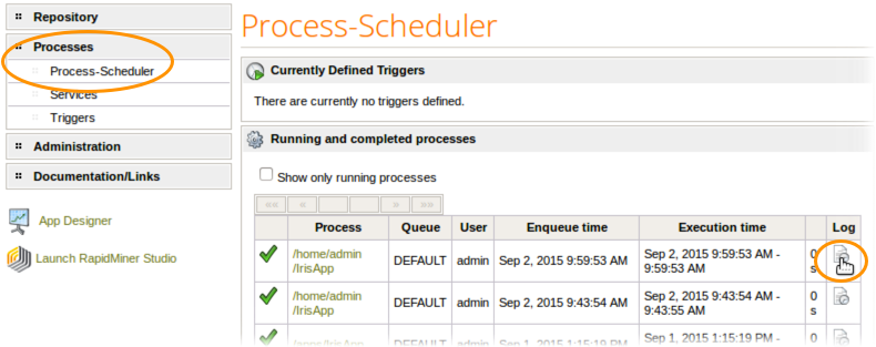 You can view process logs from the web interface of RapidMiner Server. To do so, open Processes > Process Scheduler. All processes that have run on the RapidMiner Server instance are listed: