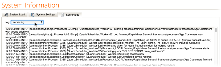 - RapidMiner Server logs record activity related to platform operations. This includes startup processes, changes to settings, database accesses, etc. Any operations error is written to the RapidMiner Server log file.
