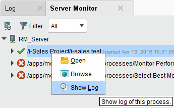 From the menu, you can select one of three options. Use the Show Log option to view process logs: