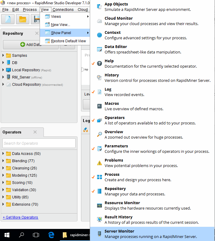 In RapidMiner Studio, use View > Show Panel > Server Monitor to open the process log view listing. The view displays all logs run on RapidMiner Server that the connected user is allowed to see.
