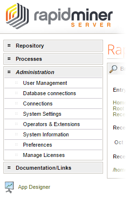 These sections describe the tasks involved in managing and maintaining RapidMiner Server. (If you have not already done so, you should first install the application.) RapidMiner Server provides a web interface for managing the users, connections, and application itself. Much of your work will be done from the RapidMiner Server Administration tab of the web interface: