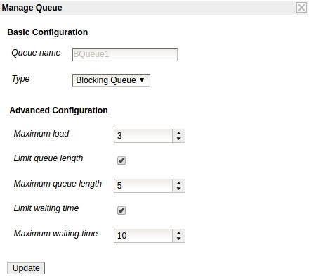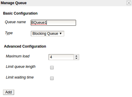 To add a Blocking Queue enter the preferred name and select Blocking Queue as the type in the Manage Dialog. This will convert the dialog as follows.