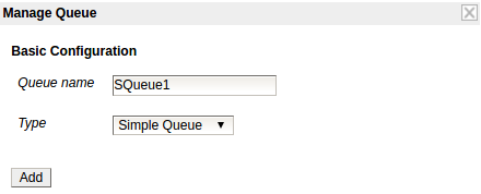 To add a Simple Queue enter the preferred name for the queue and select Simple Queue as type in the Manage Dialog: