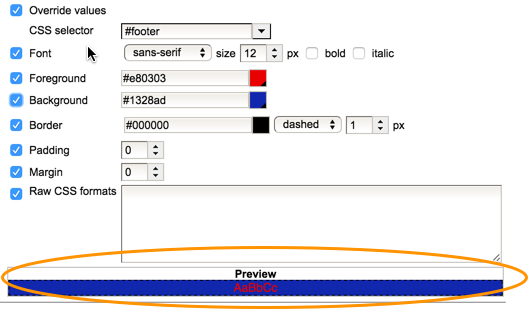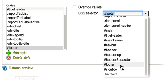 Select a style from the list on the left, or if the style is not listed on the left, select the style from the CSS selector pull-down. (You can also add new styles.) For example, to modify the footer: