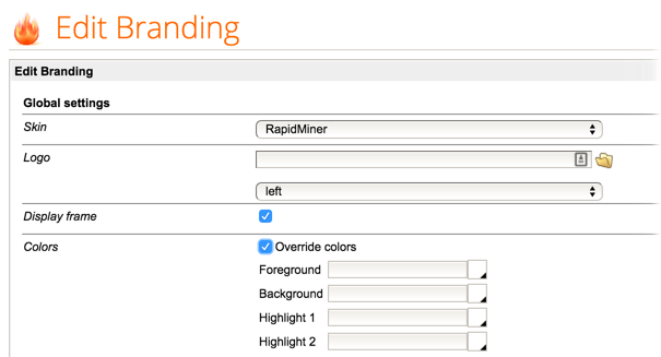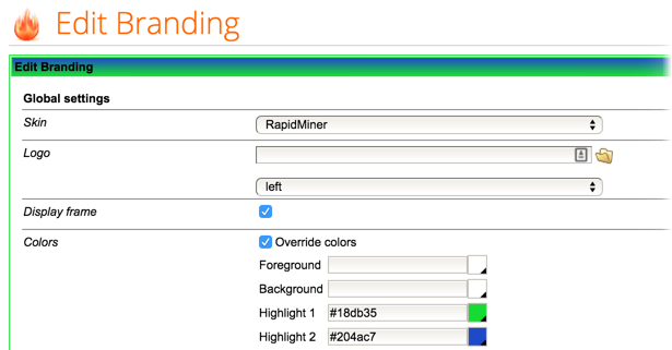 To remove the changes and restore the default, click Reset branding globally or set the Skin to RapidMiner.